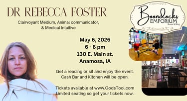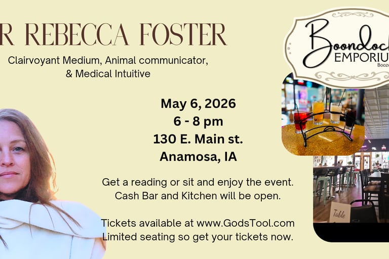 Join us at Hammer's Hideaway in Olin, Iowa on March 21, 2026! Dr Foster will provide 2 hours of spiritual and clairvoyant messages from God, Spirit Guides, and those passed over. Keep in mind she does not consult the dead, she simply passes on their messages. She is also an animal communicator, remote viewer, and medical intuitive. Her journey started 40 years ago and is comprised of over 60,000 readings, trips across the country conducting gallery readings, private parties, and speaking events, and has worked on investigations, television, and radio programs. She is the author of five books, the owner of a shop in Anamosa, a certified holistic practitioner, and a certified spiritual life coach.