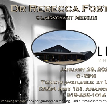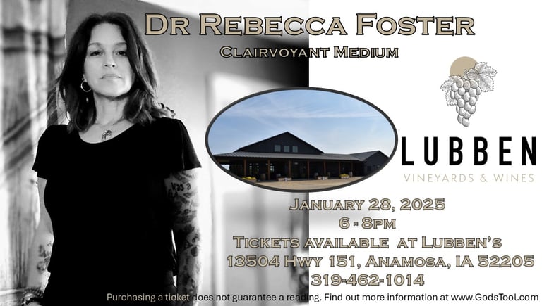 Dr Foster will spend two hours reading the audience. She passes on messages from God, Spirit Guides, and those passed over, including pets and animals. She does not consult the dead or ask them questions. The evening is filled with messages that touch the entire group, with many being meant to reach a person without calling them out or putting them on the spot. Not everyone who purchases a ticket will get a personal reading; however, everyone leaves with something that has touched them personally. You will experience laughter, tears, enlightenment and confirmation.